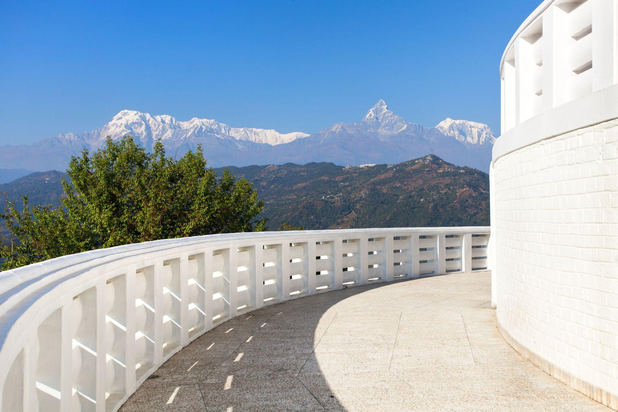 A serene white stupa perched on a hill with panoramic views of Phewa Lake and the Himalayas — perfect for peaceful moments and stunning photos.